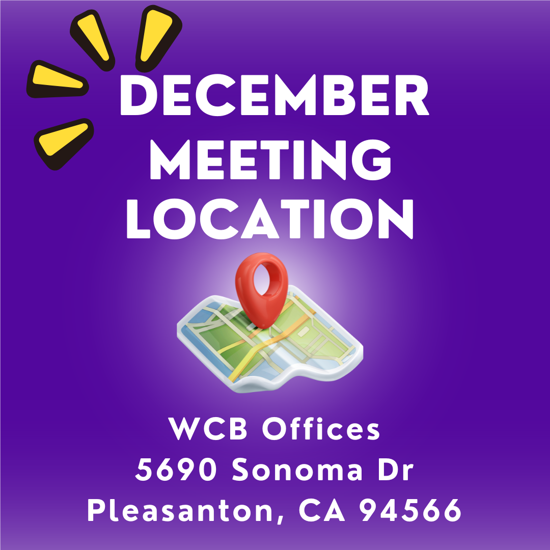 Our club meetings on December 2 and December 9 will be held at the Wall and Ceiling Bureau (WCB) offices, at 5690 Sonoma Dr, Pleasanton, CA 94566.